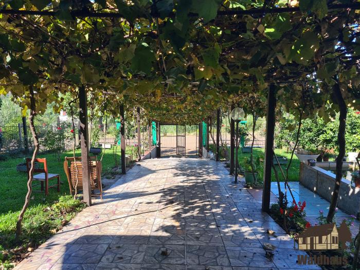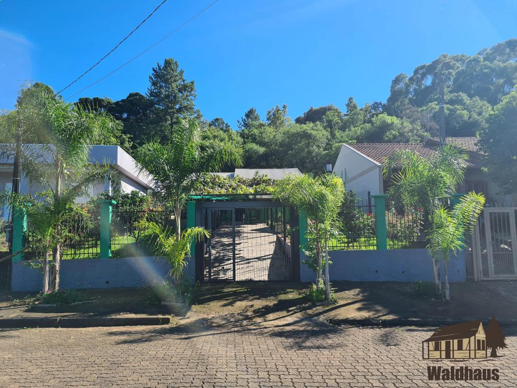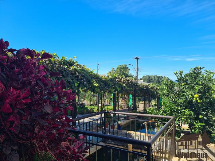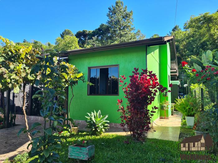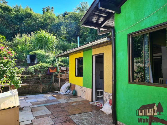 Casa de alvenaria com dois dormitórios, sala, cozinha, banheiro e espaço gourmet com fogão campeiro.